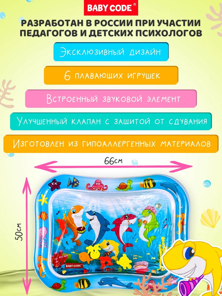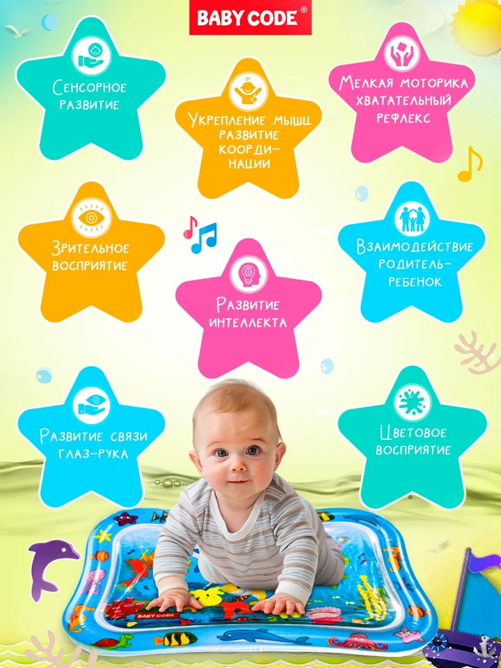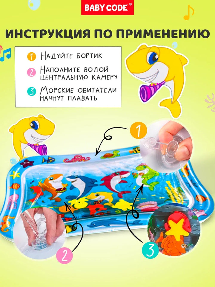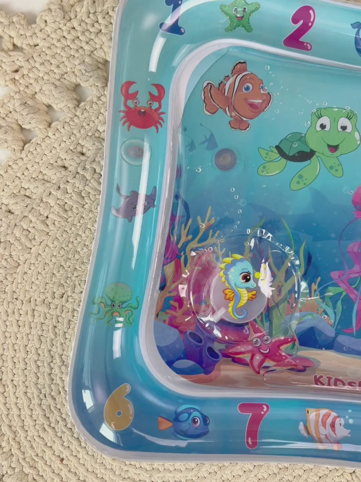 Covorașul se umple simplu cu apă și aer, iar bebelușul se va distra urmărind cum personajele marine se mișcă la fiecare apăsare. Este o jucărie educativă și interactivă care încurajează timpul petrecut pe burtică și susține dezvoltarea fizică.