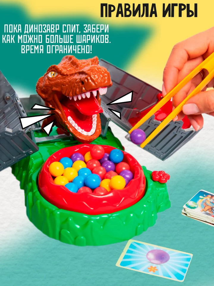 Descoperă adrenalina cu jocul interactiv „Dinozaur Furios”! Ideal pentru petreceri și momente amuzante în familie, acest joc îi provoacă pe copii și adulți să fie rapizi și atenți. Sarcina este simplă și palpitantă: colectează cât mai multe bile colorate cu bețișoarele speciale înainte ca dinozaurul să se trezească și să „atace”.