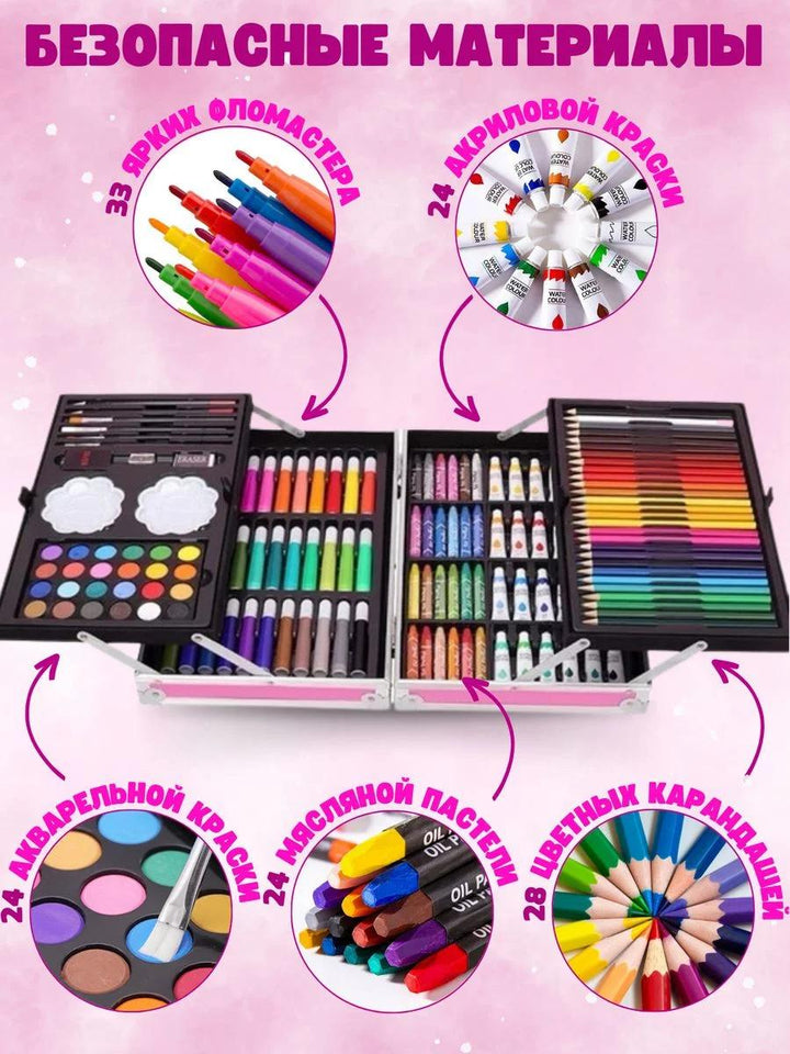 - 🖍️ 148 de piese – include creioane colorate, markere, acuarele, pensule și multe altele