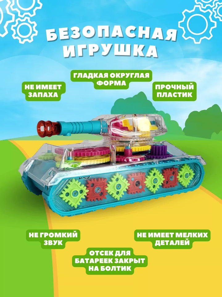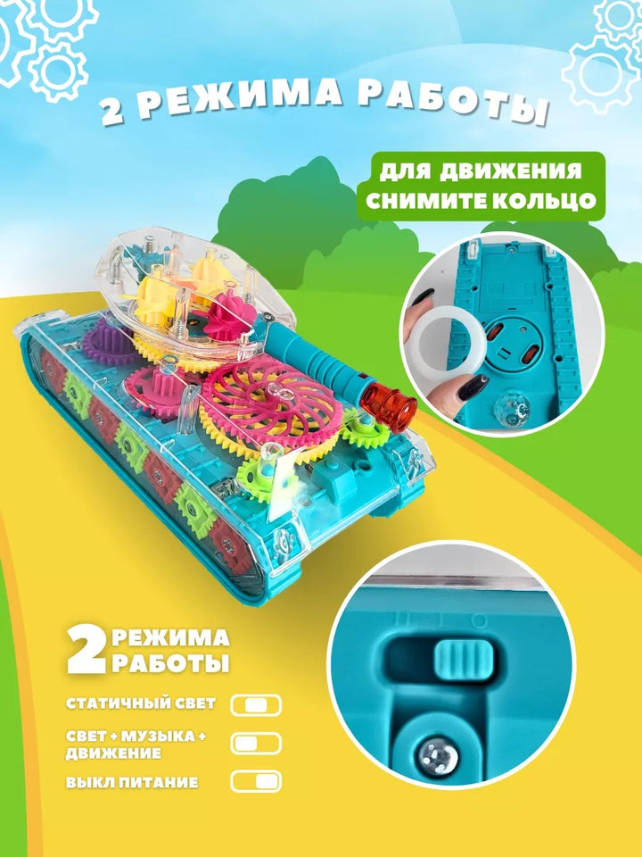 Acest tanc luminos cu roți dințate oferă ore întregi de joacă captivantă! Se mișcă singur, se rotește la 360° și luminează în culori vibrante.
