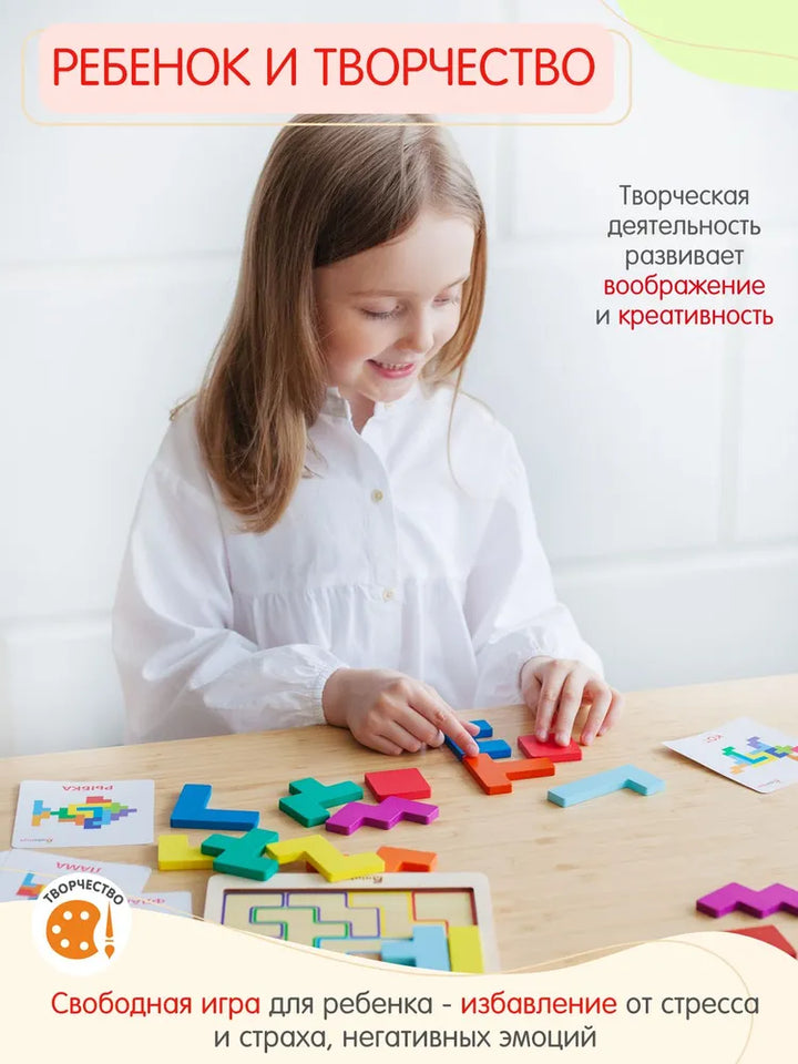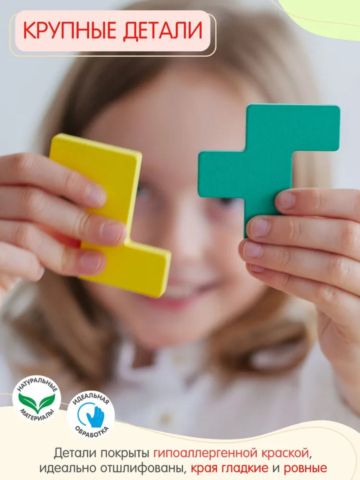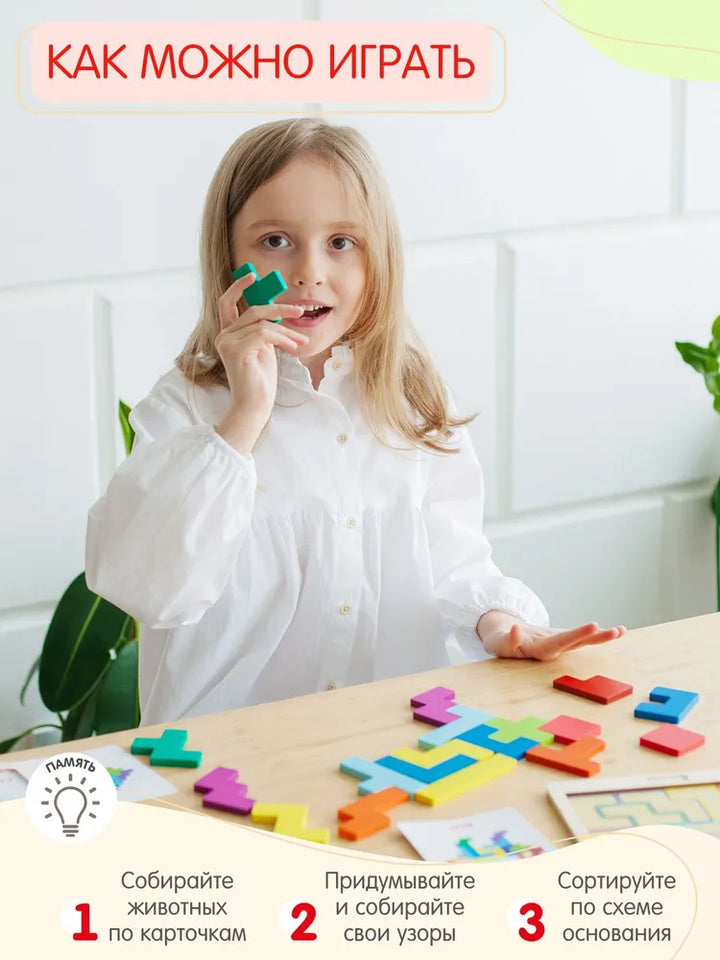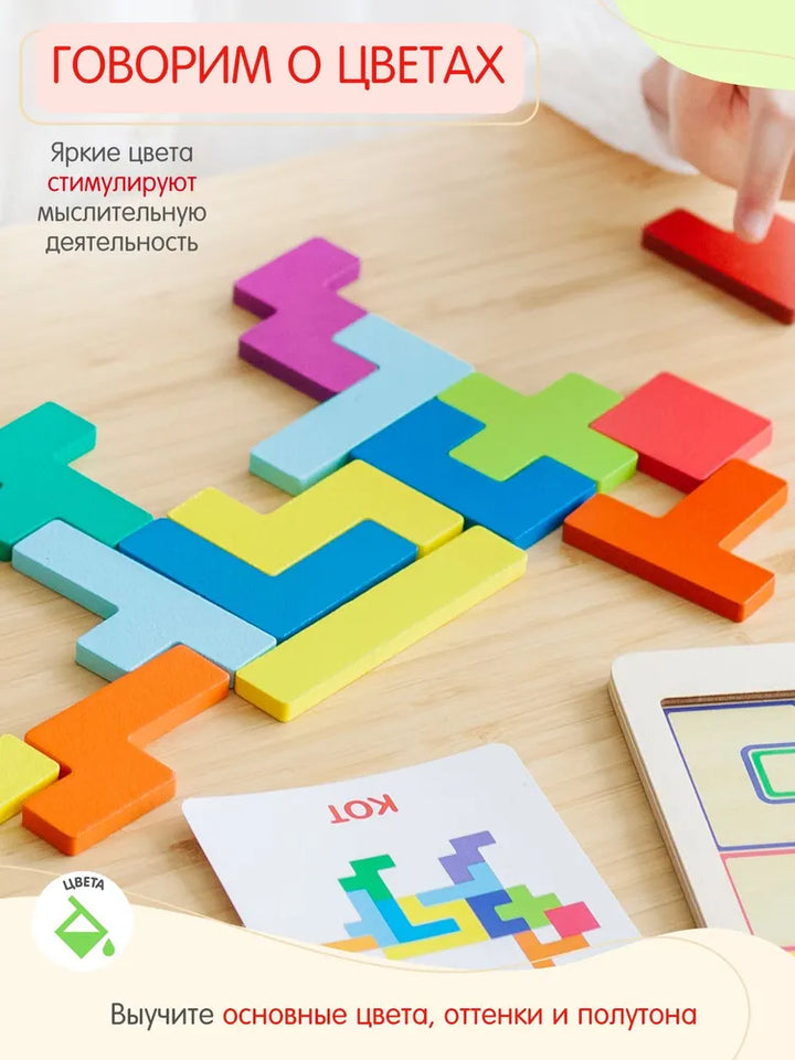 Setul include piese colorate din lemn + carduri cu modele de joc.